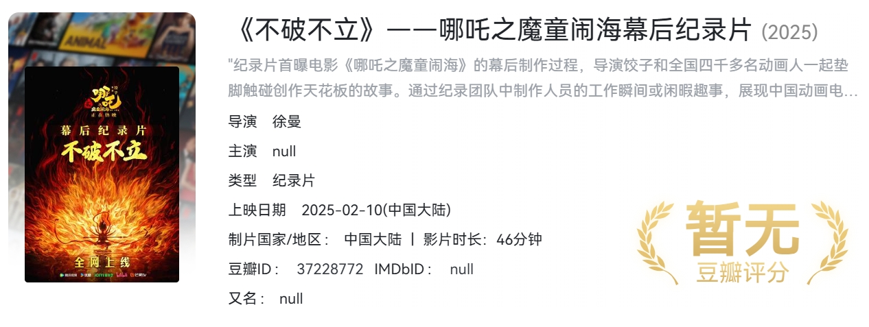 【不破不立—哪吒之魔童闹海幕后纪录片】(2025)【4K】简中字幕 【2.6G】 栏目:纪录片 作者:虎大 时间:2025-12-02 13:39:02   **剧情简介:** 纪录片首曝电影《哪吒之魔童闹海》的幕后制作过程,导演饺子和全国四千多名动画人一起垫脚触碰创作天花板的故事。通过纪录团队中制作人员的工作瞬间或闲暇趣事,展现中国动画电影人不断突破想象力、突破自我、突破极限的顽"强精神与乐观态度,及"人生不设限"的价值观。 > [!success] **资源链接** > https://pan.quark.cn/s/eb89c09c6384 版权声明:本站不存储任何实质资源,该帖为发布的网盘链接介绍帖。如您认为本站任何介绍帖侵犯了您的合法版权,请联系站长 ( 微信:bao867270 ) 进行投诉,我们将在确认本文链接指向的资源存在侵权后,立即删除相关介绍帖子!