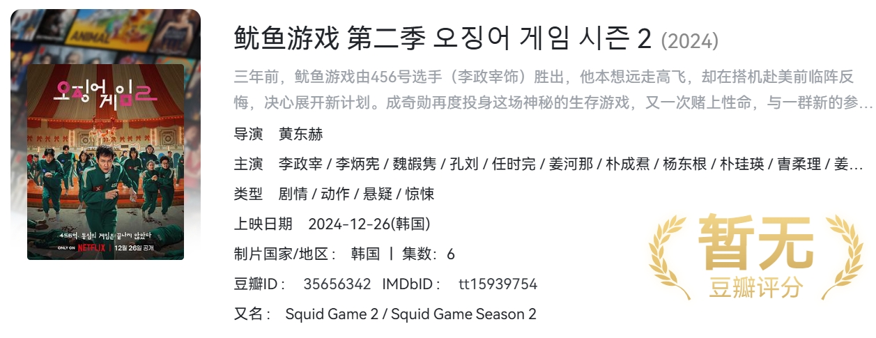 鱿鱼游戏 第二季(2024)【两季全】【NF / 4K / HDR10 / 高码率】【6G/集】【杜比全景声】【韩英双语】【内封中字】 栏目:剧集区 作者:虎大 时间:2025-12-02 14:17:55   **简介:** 三年前,鱿鱼游戏由456号选手(李政宰饰)胜出,他本想远走高飞,却在搭机赴美前临阵反悔,决心展开新计划。成奇勋再度投身这场神秘的生存游戏,又一次赌上性命,与一群新的参赛者一起争夺高达456亿韩元的奖金。 > [!success] **资源链接** > https://pan.quark.cn/s/2dd31e1333fe 版权声明:本站不存储任何实质资源,该帖为发布的网盘链接介绍帖。如您认为本站任何介绍帖侵犯了您的合法版权,请联系站长 ( 微信:bao867270 ) 进行投诉,我们将在确认本文链接指向的资源存在侵权后,立即删除相关介绍帖子!