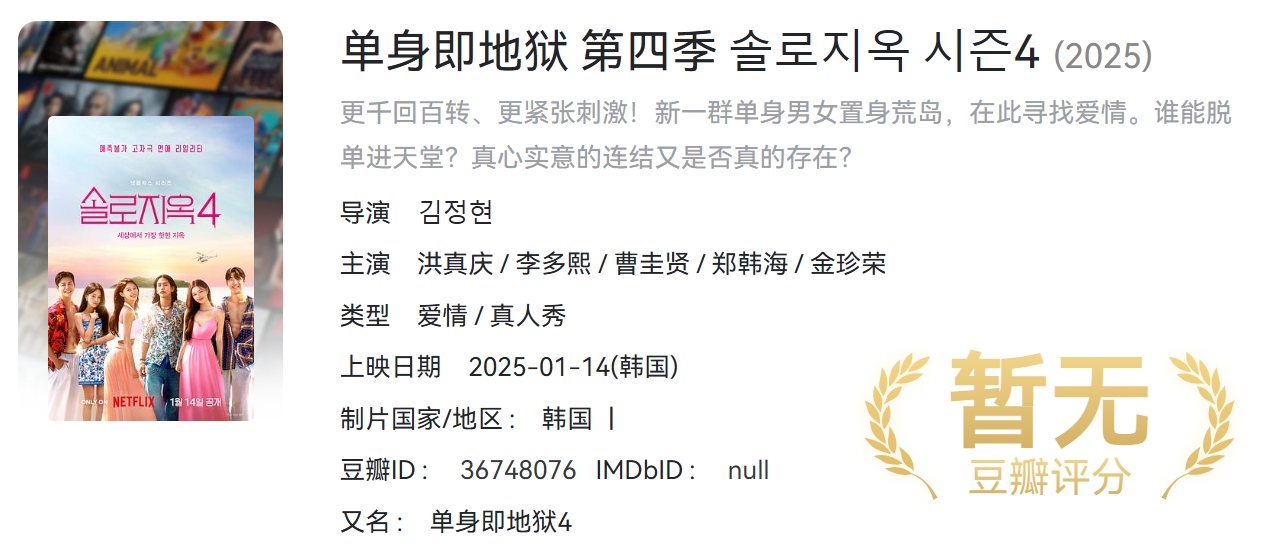 【2025韩综】《单身即地狱 第四季》 【同步更新】【附1-3季】[韩国]【1080P】【77.2G】【官中字幕】 栏目:综艺区 作者:虎大 时间:2025-12-02 12:34:28   **简介:** 俊男靓女被困“地狱岛”,逃离方法只有一个:每晚与某人成为情侣。配对成功的人当晚可搬去“天堂岛”,享受优质食物和住宿,而未找到伴的人,晚上得在“地狱岛”自力更生 > [!success] **资源链接** > https://pan.quark.cn/s/1e500f799170 版权声明:本站不存储任何实质资源,该帖为发布的网盘链接介绍帖。如您认为本站任何介绍帖侵犯了您的合法版权,请联系站长 ( 微信:bao867270 ) 进行投诉,我们将在确认本文链接指向的资源存在侵权后,立即删除相关介绍帖子!